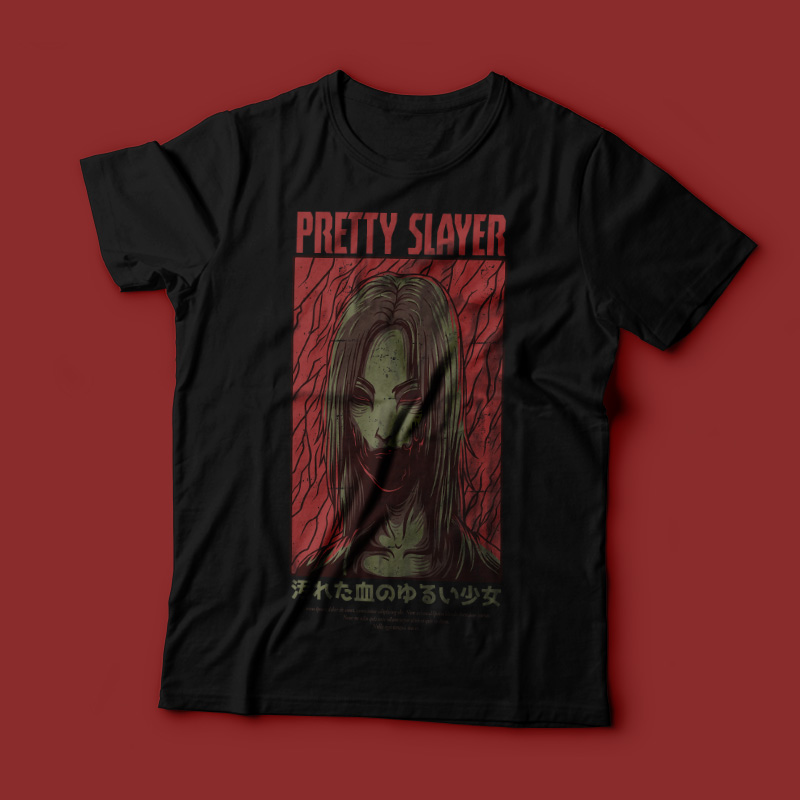 Pretty Slayer it's a character design that was made in Adobe Illustrator. Based on vector file, easy to resize and edit. File features AI, EPS, and PNG all in zip, CMYK color mode and 4 color. Can be used for digital printing and screen printing.