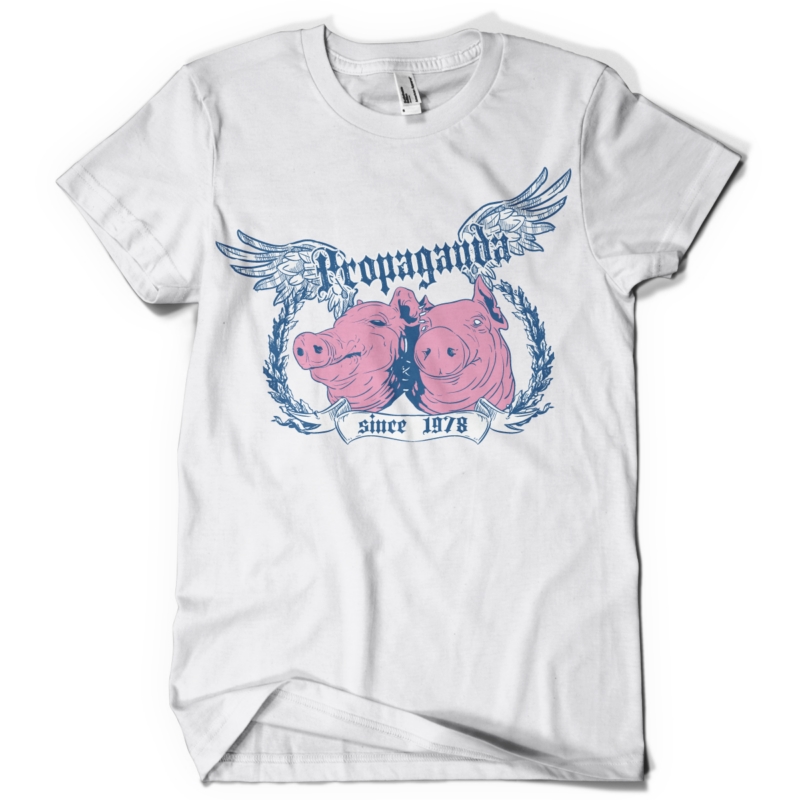 Propaganda is a digital design featuring detailed pigs and wings.The t-shirt template will be available in vector format for Adobe Illustrator, Adobe Photoshop and Corel Draw and can be used for digital printing and screenprinting .