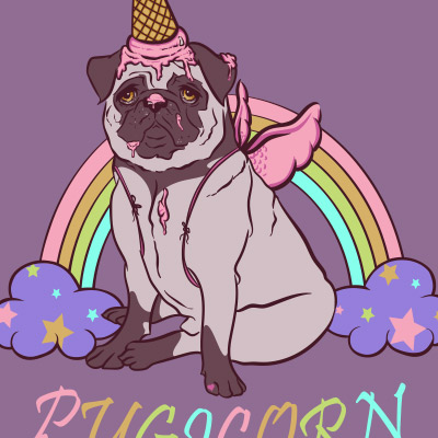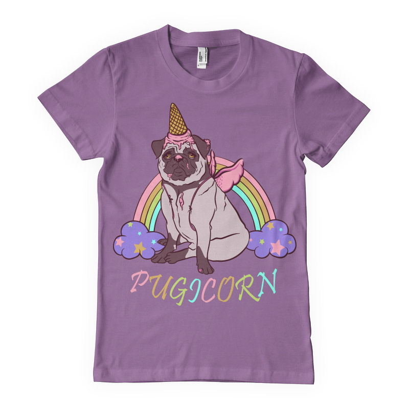 Pugicorn T-Shirt Design. Digital illustration featuring detailed Pug with ice cream for corn and rainbow at the back.The colors are changeable. The source file is available in AI, EPS, PNG, PSD and SVG format.