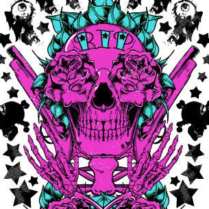 Purple rose graphic design template in vector format, featuring detailed pink skull with rose eyes now available for Adobe Illustrator, Adobe Photoshop and Corel Draw and can be used for digital printing and screenprinting .