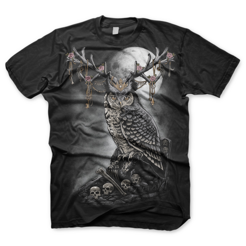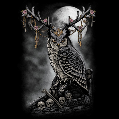 "queen of owl" is a unique illustration of a owl with the skull and some of jewellery... just curious ...if owl has a queen,just want to know what would be...and this is it....just my fiction imagination of course,i hope you all like it,with use grey darker colors, so even though spooky, but still look cool and cute if in wearing on a shirt . File contains a PSD file