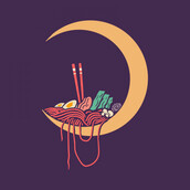 Ramen to The Moon is a vintage illustration that is suitable for t-shirts, jackets, or merchandise with the theme of moon, space, planet, astronaut, ufo, alien, crescent, noodle, ramen, food, cuisine, japanese, asian, pasta, ramen noodles.