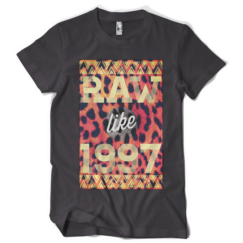 "raw like 97" Artwork created in Adobe Photoshop. The file available for the client upon purchase and download are 1 layered file in TIFF (with transparency) format designed for DIRECT TO GARMENT printing. Also available upon request is 1 file in PDF format, layered, designed for the SCREEN PRINTING.