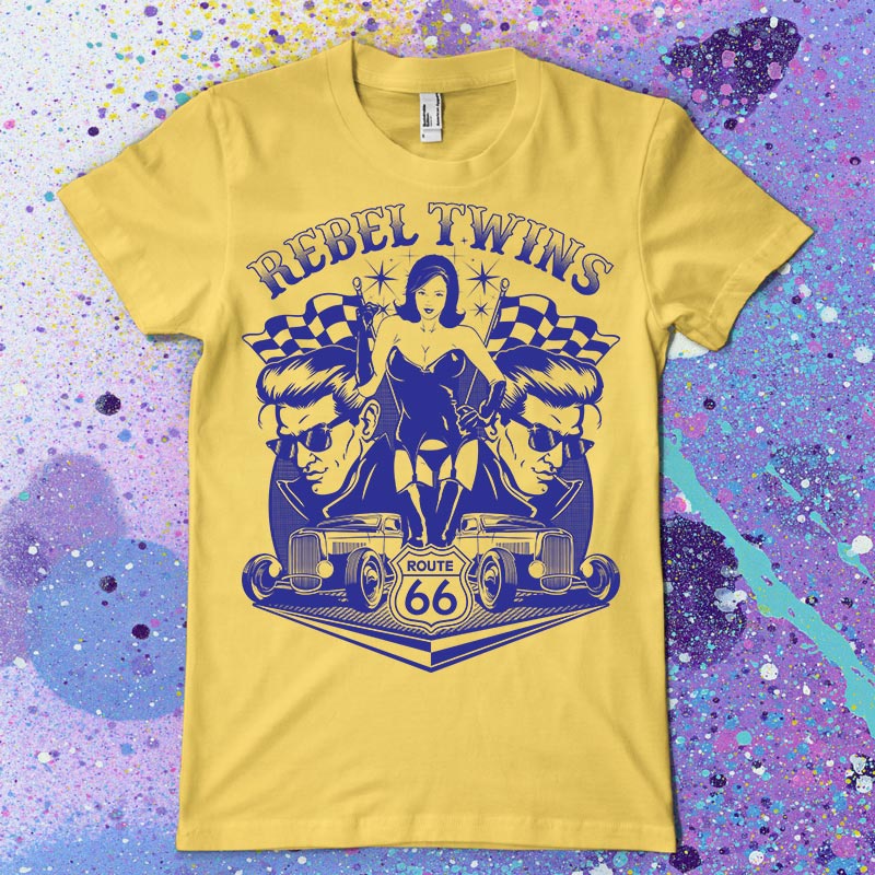 Rebel Twins t-shirt design features a hot rod race design detailed screen print now available for Adobe Illustrator, Adobe Photoshop and can be used for digital printing and screenprinting.