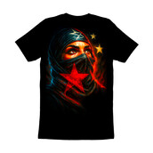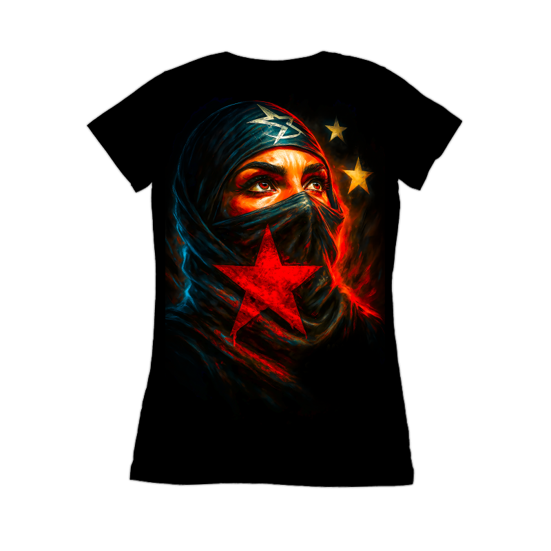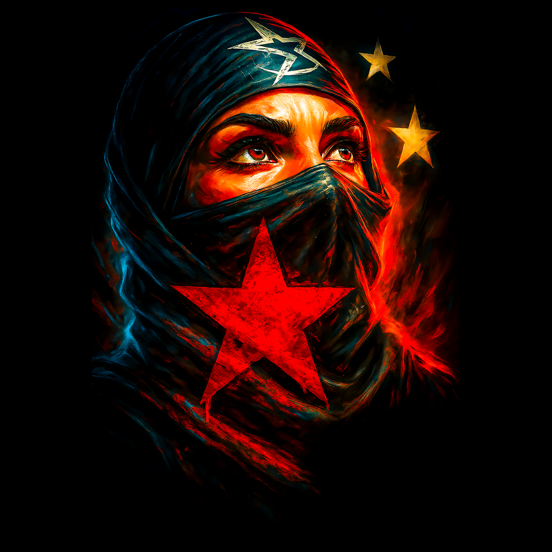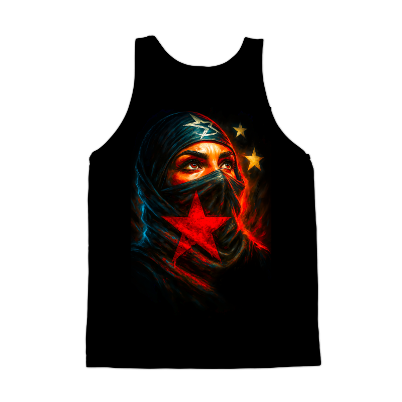 This striking design features a woman with piercing eyes, partially veiled, evoking a sense of mystery and strength. A prominent red star is emblazoned across her chest, while smaller gold stars adorn her headwear and float beside her. The color palette is dominated by fiery reds and oranges, contrasted by cooler blues and blacks, creating a dramatic and intense visual. The artistic style leans towards a modern, digitally painted aesthetic, with textured brushstrokes adding depth and dimension. The overall effect is powerful and captivating, suggesting themes of rebellion, resilience, and hidden identity. The background is dark, emphasizing the figure and her intense gaze, drawing the viewer into her world.