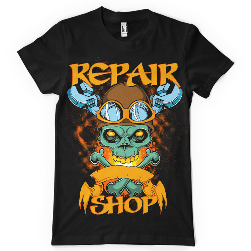 Repair shop t-shirt print features a detailed design available for Adobe Illustrator, Adobe Photoshop and Corel Draw and can be used for digital printing and screenprinting . Ready to print or use in anything you want.