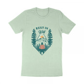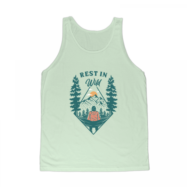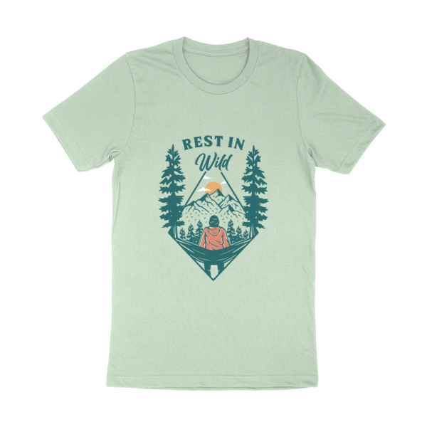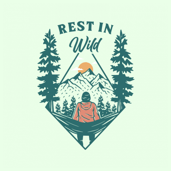 Rest in Wild is a vintage illustration that is suitable for t-shirts, jackets, or merchandise with the theme of camping, tent, campfire, mountains, national park, adventure, summer, holiday, travel, nature, outdoors, hiking, trees, forest, wild.