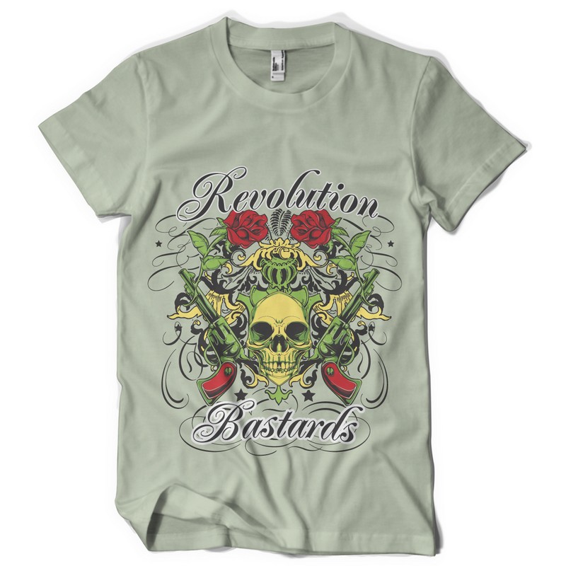 Revolution bastards graphic design template in vector format, featuring detailed skull and guns now available for Adobe Illustrator, Adobe Photoshop and Corel Draw and can be used for digital printing and screenprinting .