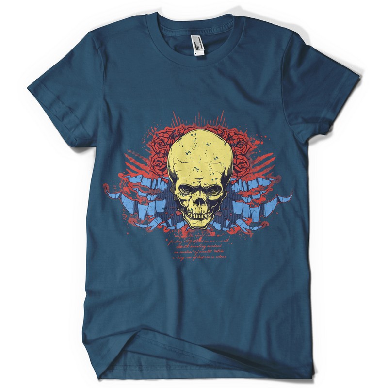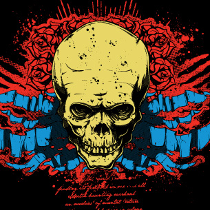 Ribbon skull digital design template in vector format, featuring detailed skull and roses now available for Adobe Illustrator, Adobe Photoshop and Corel Draw and can be used for digital printing and screenprinting .