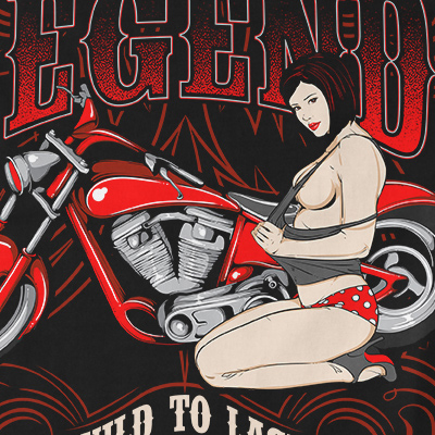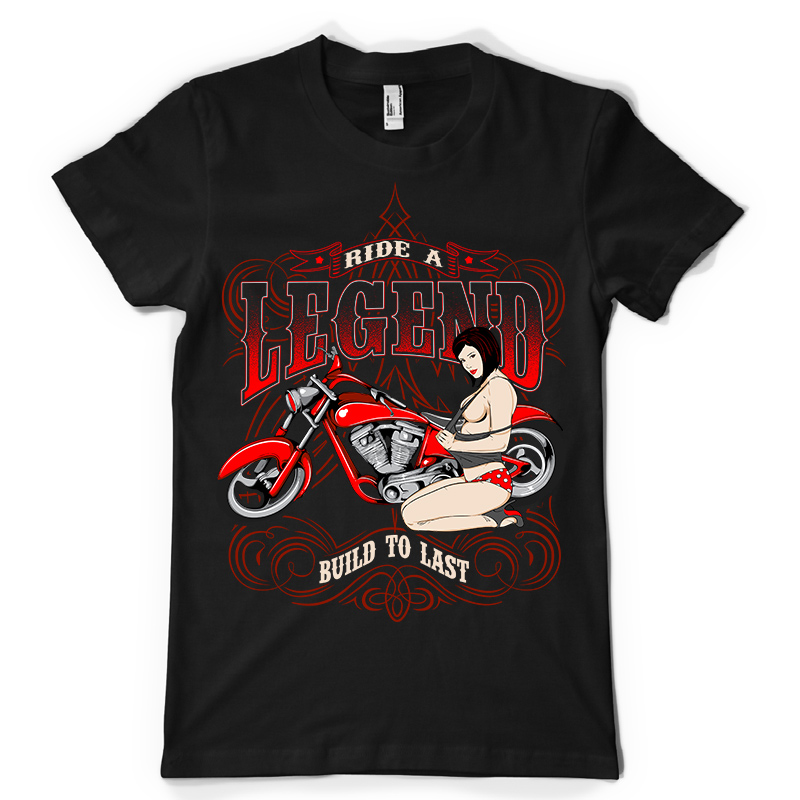 Ride A Legend design features a pin up bikers detailed screen print now available for Adobe Illustrator, and Corel Draw and can be used for digital printing and screenprinting.