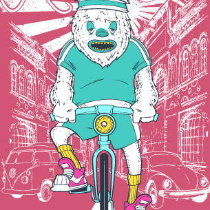 Sportive hairy monster riding a bike on a city background