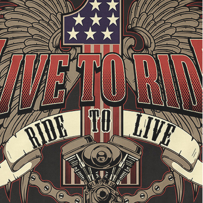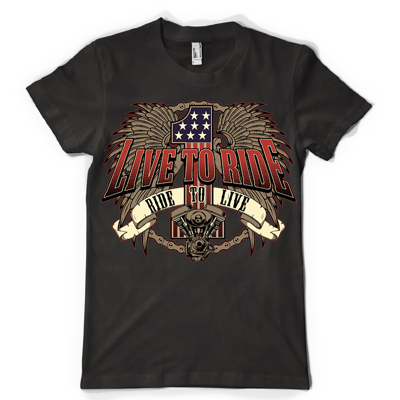 Live To Ride design features a Shield Motors detailed screen print now available for Adobe Illustrator, Adobe Photoshop and Corel Draw and can be used for digital printing and screenprinting