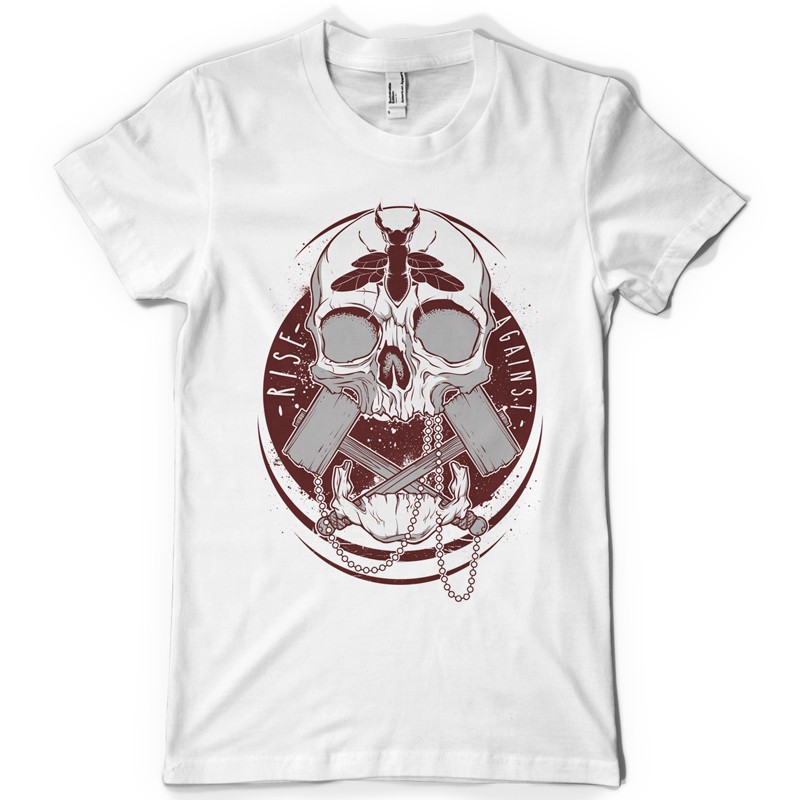 Rise against printed t-shirt features a detailed screen print of skull and hammers now available for Adobe Illustrator, Adobe Photoshop and Corel Draw and can be used for digital printing and screenprinting .
