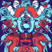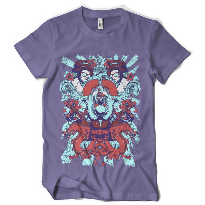 Rising sun graphic design template in vector format, featuring detailed retro divas and dragon mask now available for Adobe Illustrator, Adobe Photoshop and Corel Draw and can be used for digital printing and screenprinting .