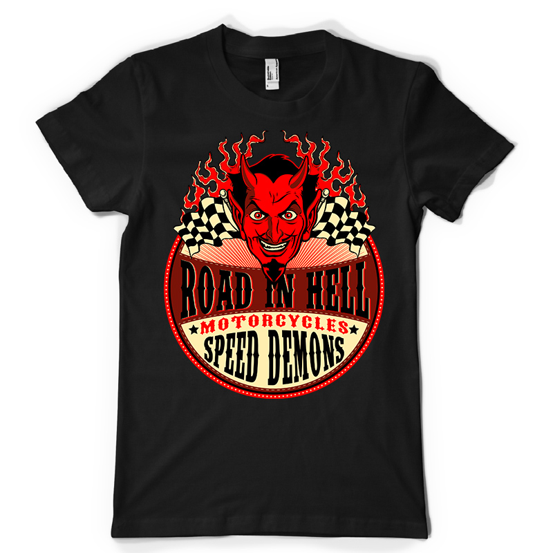 Road in Hell in Adversity design features a devil motor detailed screen print now available for Adobe Illustrator, and Corel Draw and can be used for digital printing and screenprinting.