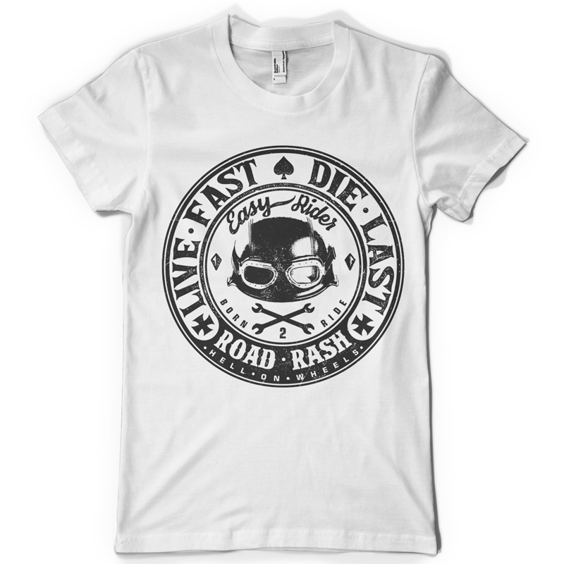 Road Rash T-shirt design featuring biker helmet, tools and typography. The files available are suitable for Adobe Illustrator, Adobe Photoshop and Corel Draw and can be used for digital printing and screenprinting.