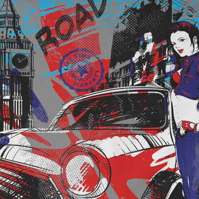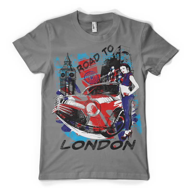 Road to London t-shirt design features a detailed screen print of sexy girl and retro car now available for Adobe Illustrator, Adobe Photoshop and Corel Draw and can be used for digital printing and screenprinting .