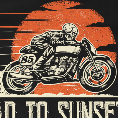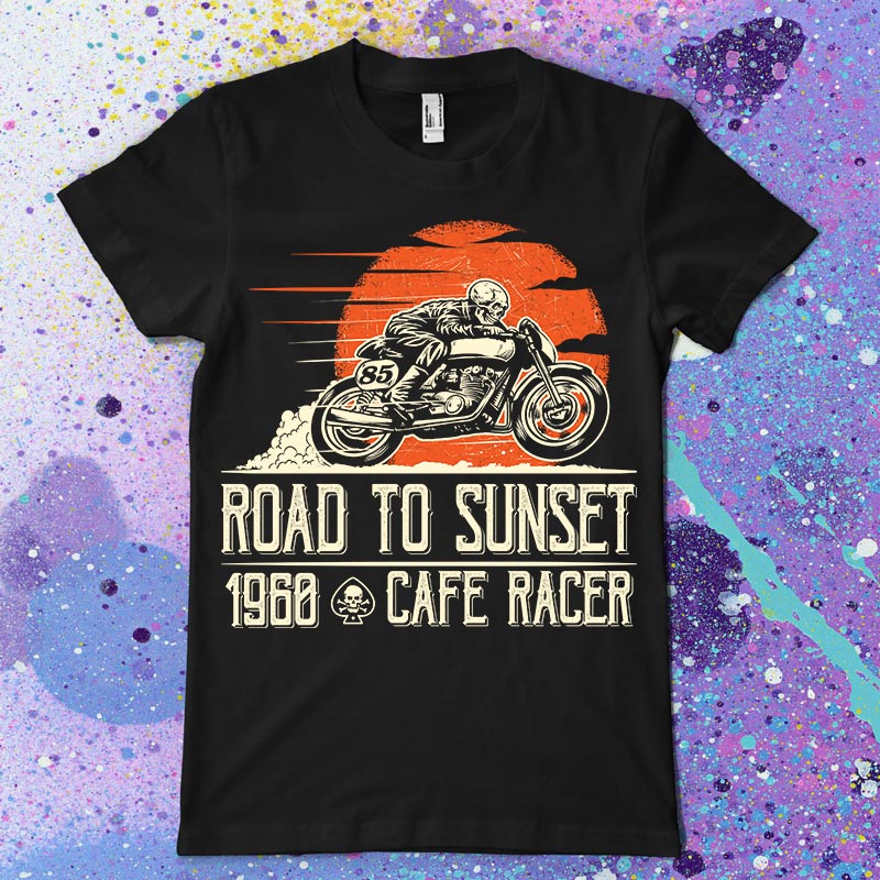 Road to Sunset t-shirt design features a cafe racer design detailed screen print now available for Adobe Illustrator, Adobe Photoshop and Corel Draw and can be used for digital printing and screenprinting.