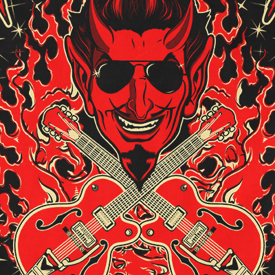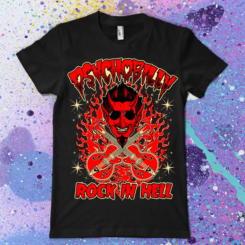 Rock in Hell t-shirt design features a psychobilly design detailed screen print now available for Adobe Illustrator, Adobe Photoshop and Corel Draw and can be used for digital printing and screenprinting