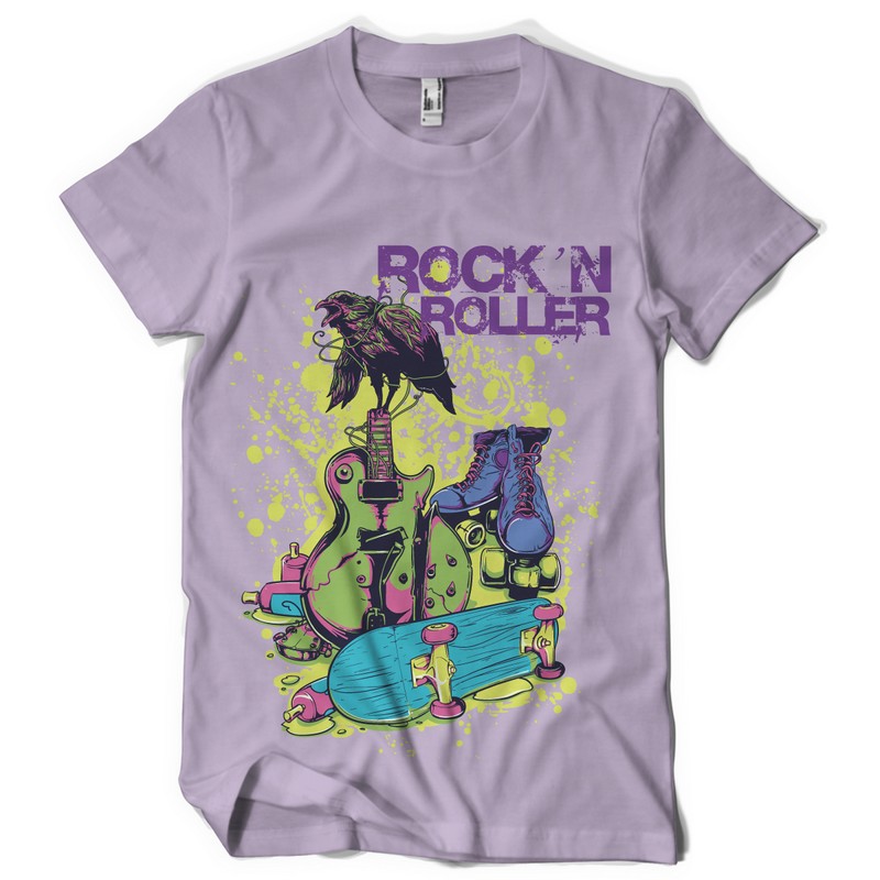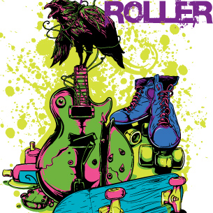 Rock'n Roller digital design template in vector format, featuring detailed urban details like guitar rollers every teenager life now available for Adobe Illustrator, Adobe Photoshop and Corel Draw and can be used for digital printing and screenprinting .