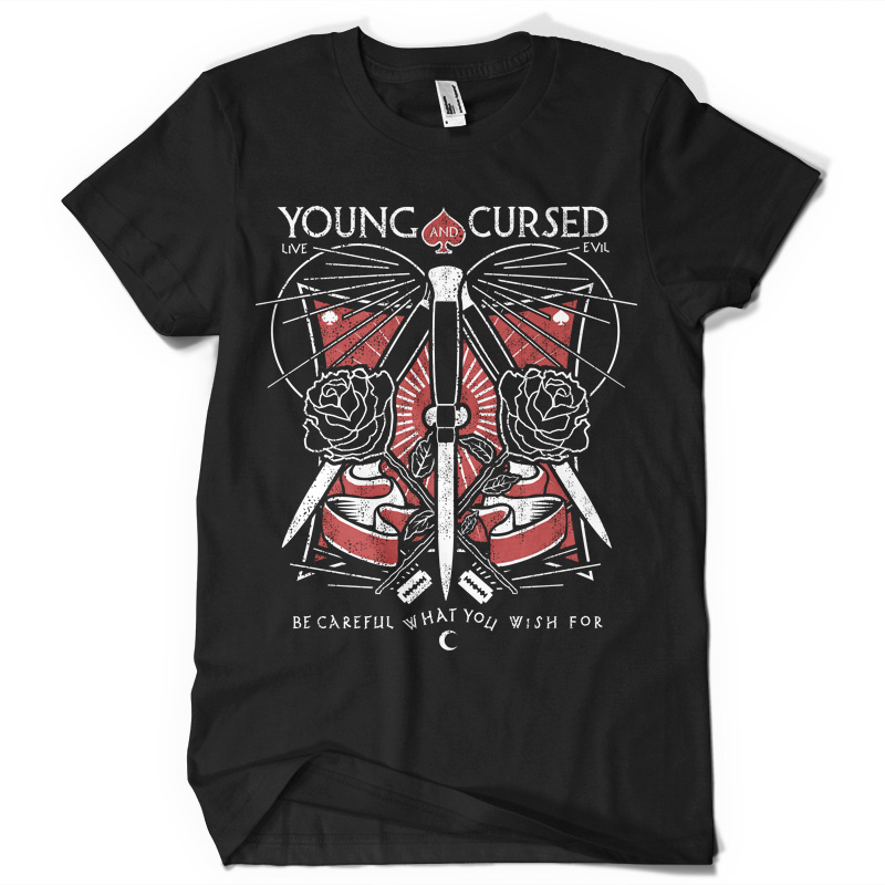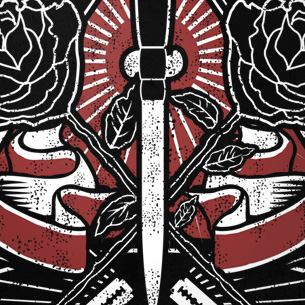 Romance and Violence printed t-shirt features a detailed screen print of knifes and roses now available for Adobe Illustrator, Adobe Photoshop and Corel Draw and can be used for digital printing and screenprinting .