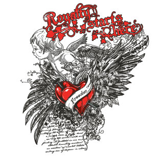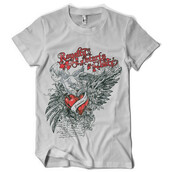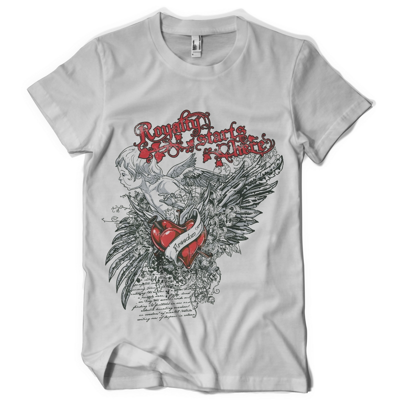 T-shirt design presents detailed nailed heart carried by an angel is now available in vector format for Adobe Illustrator, Adobe Photoshop and Corel Draw and can be used for digital printing and screenprinting .