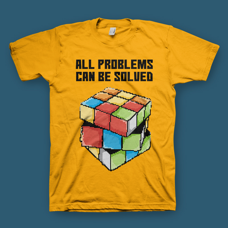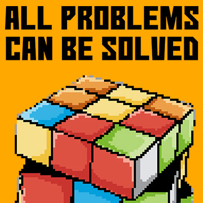 Rubik, all problems can be solved. Motivational quote mixed with pixel art illustration style and retro video games box art.