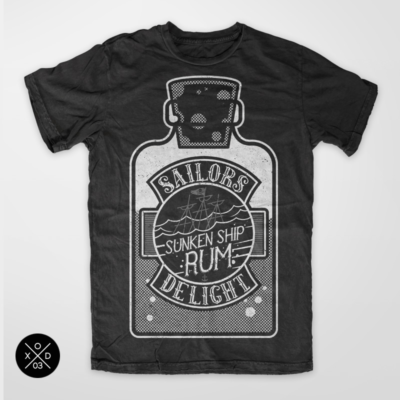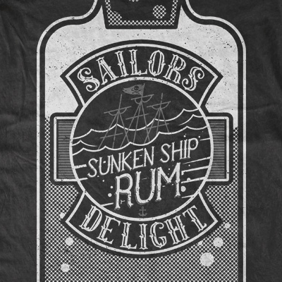 "RUM" graphic design template in vector format, featuring rum bottle with a pirate inspired label, now available for Adobe Illustrator and can be used for digital printing and screenprinting .