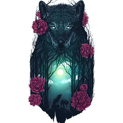 "Running With The Wolves" is a unique illustration of wolves in a forest of a wolf. This design is very unique due to its style and colors which will stand out on any tee in any color. File contains a PSD file with 17 x 24 in size.
