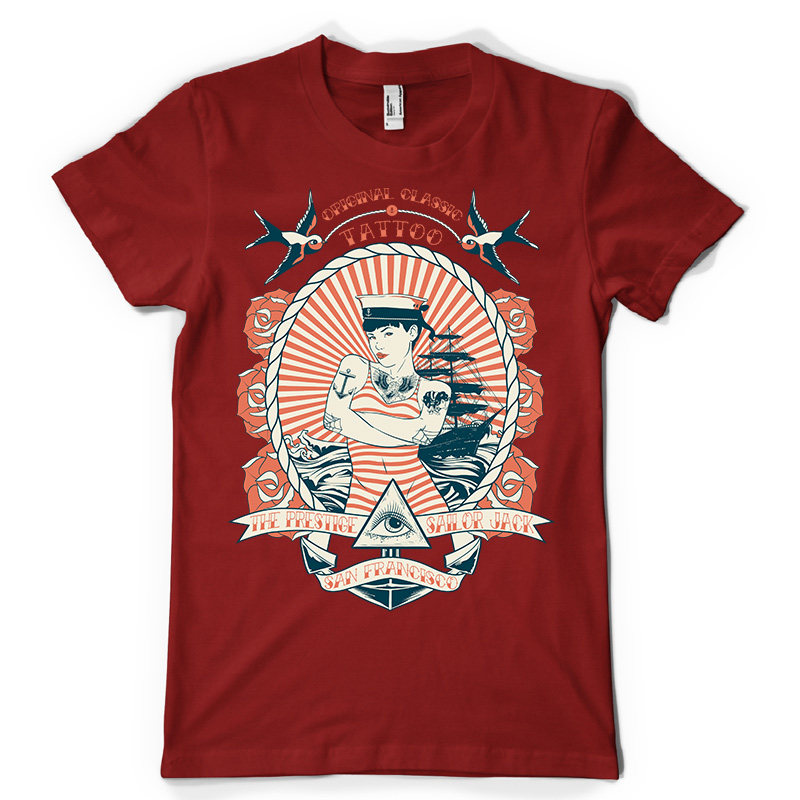 Sailor Classic Tattoo t-shirt design features a vintage pin-up tattoo detailed screen print now available for Adobe Illustrator, Adobe Photoshop and Corel Draw and can be used for digital printing and screenprinting