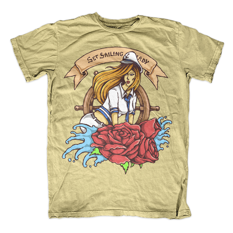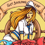 Vector illustration of blonde sailor girl with anchor, rose and banner, made with vintage tattoo style drawing. Ready to print on t-shirt.