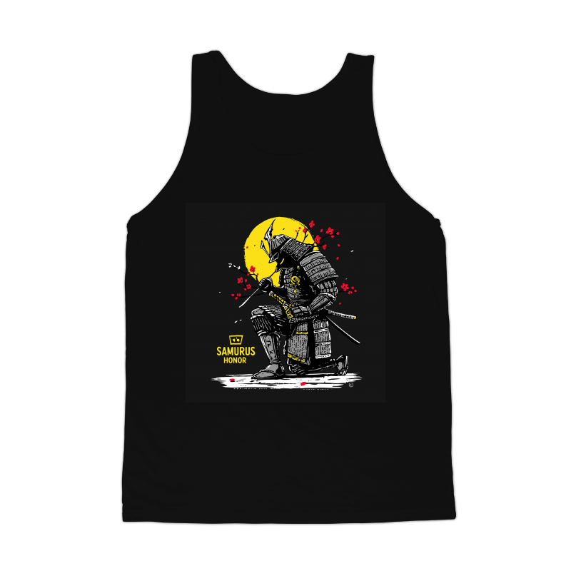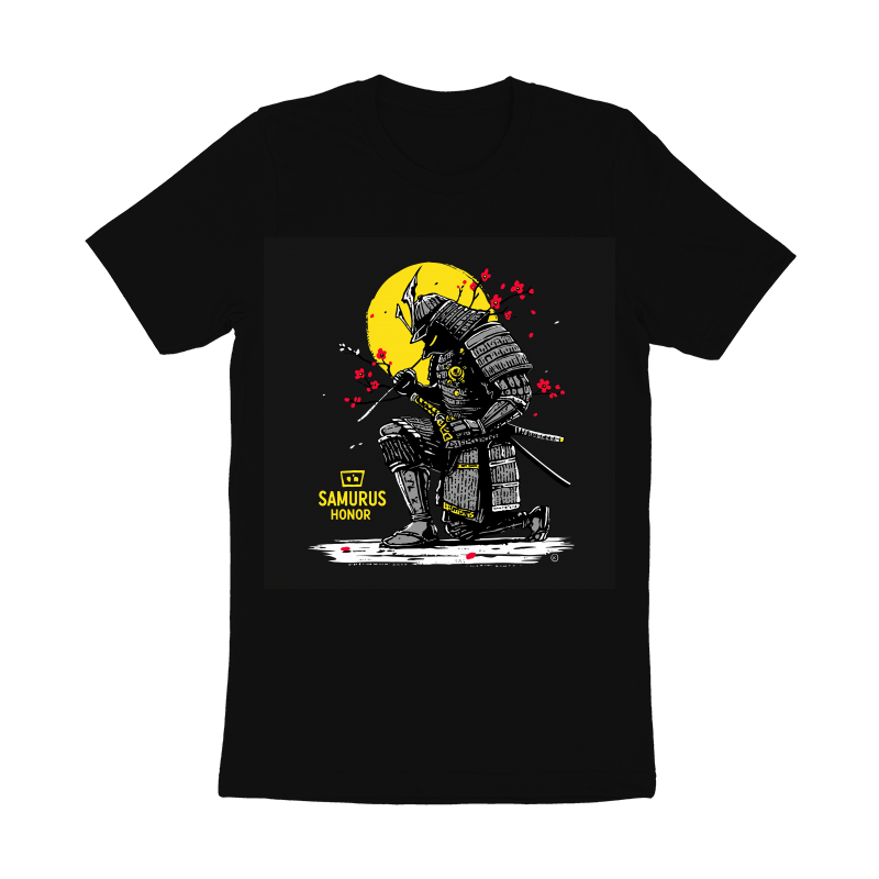 This striking illustration depicts a samurai warrior kneeling in a pose of respect or contemplation. The samurai is clad in detailed, traditional armor, rendered in a bold, graphic style with strong lines and shading. Behind the warrior, a large, stylized yellow moon provides a dramatic backdrop, complemented by delicate branches of red cherry blossoms. The overall color palette is stark, with blacks, grays, and yellows dominating, punctuated by the vibrant red of the blossoms. The design includes stylized text reading 'Samurus Honor,' adding to the thematic elements of the artwork. The composition is balanced, drawing the eye to the central figure while incorporating elements of nature and symbolism.