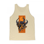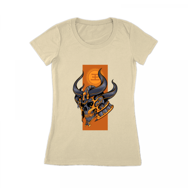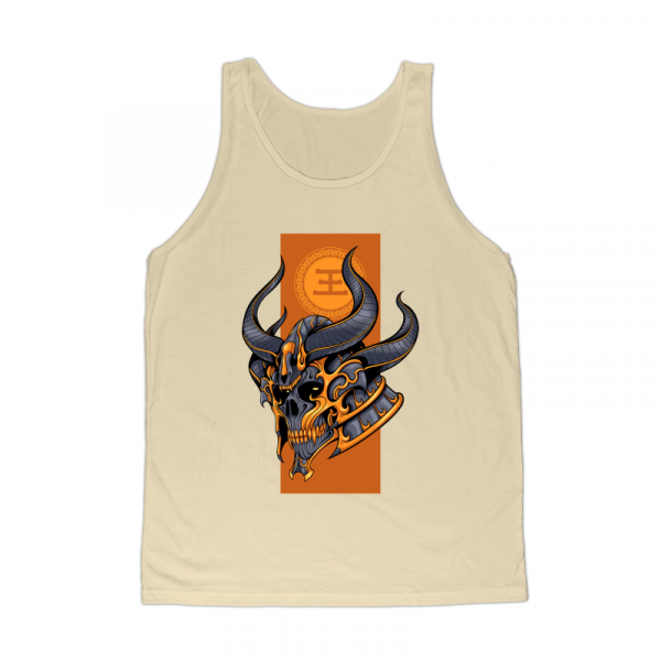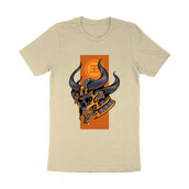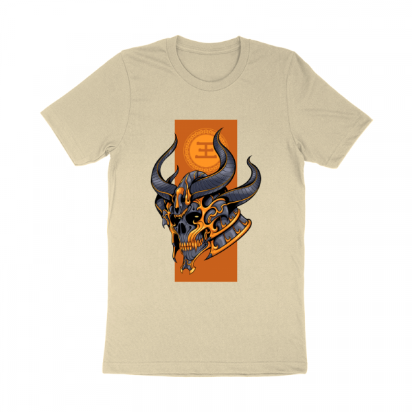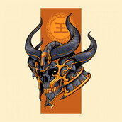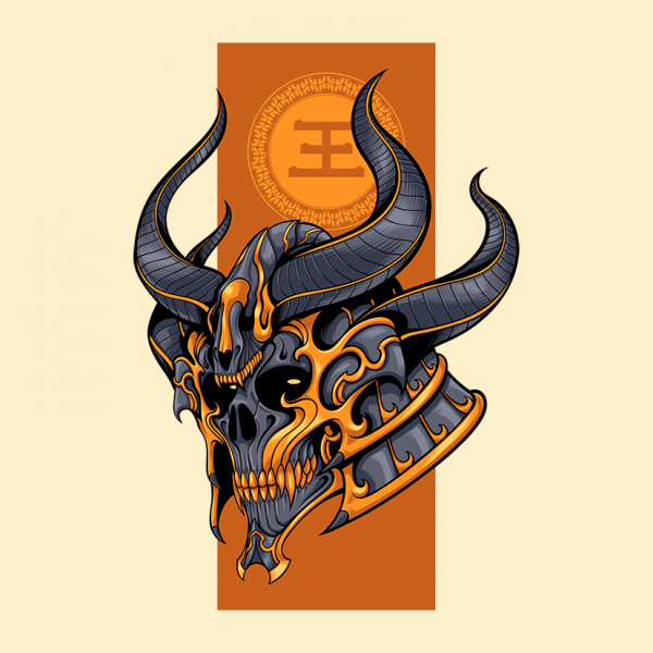Illustration of samurai skull. the goat horns make him look so menacing. The core concept was a demon king wearing a samurai helmet. The monochromatic dark color combine with one contrast color makes it more stand out on a shirt.