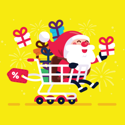Superfunny and cute Santa Claus ride a shopping cart and brought gifts and discounts for everyone!