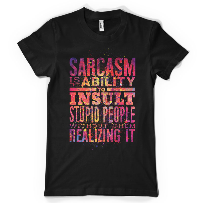"Sarcasm" is a unique typography of the quote "Sarcasm is the ability to insult stupid people without them knowing it" paired with grunge and cool neon textures and colors being incorporated with a file size of 17x24 in size with 300 in dpi.