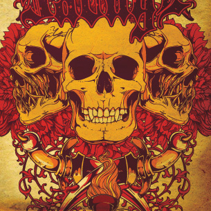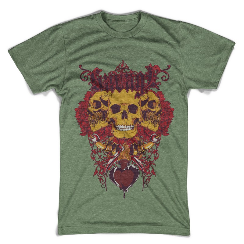 Savage trinity digital design template in vector format, featuring detailed trio of skulls now available for Adobe Illustrator, Adobe Photoshop and Corel Draw and can be used for digital printing and screenprinting .