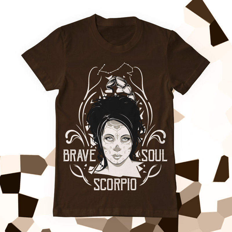 "Scorpio" design is available in high quality files, such as Ai,EPS, PDF and PNG. Vector files are organized on separate layers and all elements are editable(including text).The fonts used are 100% free for personal and commercial use(attached Read me file in the archive). Can be used for digital printing (DTG).