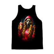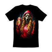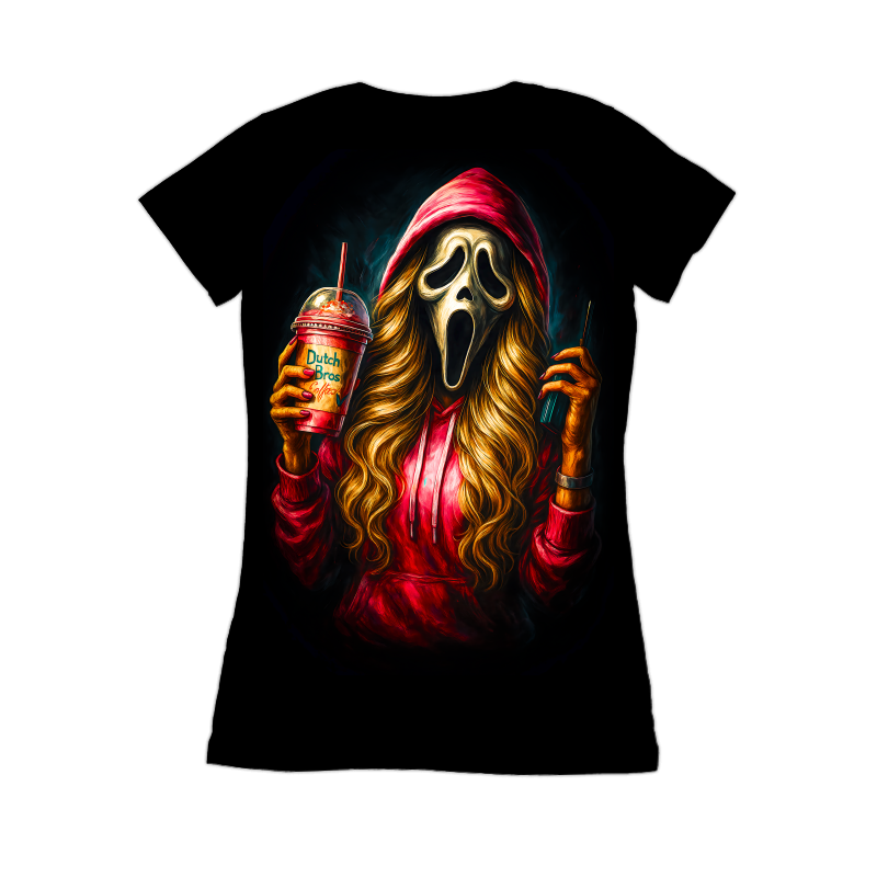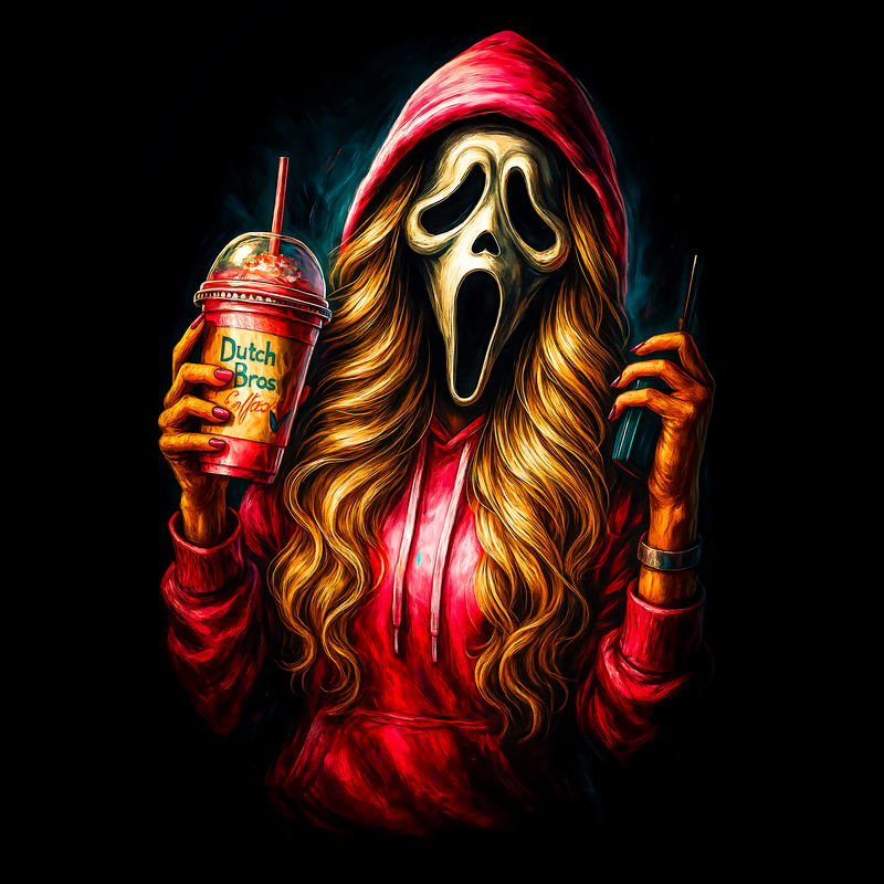 This design features the iconic Ghostface mask from the 'Scream' horror franchise, but with a modern, humorous twist. The character is depicted wearing a red hoodie and sporting long, flowing blonde hair, holding a Dutch Bros coffee drink in one hand and a walkie-talkie in the other. The artwork is vibrant and eye-catching, with bold colors and dynamic shading that give the image a sense of depth and energy. The blend of horror and pop culture elements makes this design unique and appealing. It is a playful take on a classic horror icon. The design is perfect for apparel, stickers, posters, and other merchandise. It will resonate with fans of the 'Scream' movies, as well as those who enjoy a touch of humor in their horror-themed items. Designers can use this design for a variety of merchandise, including t-shirts, posters, and stickers. It's perfect for creating unique and humorous apparel for horror fans. The design's blend of pop culture and horror makes it highly marketable and appealing to a broad audience. It could also be adapted for social media campaigns.