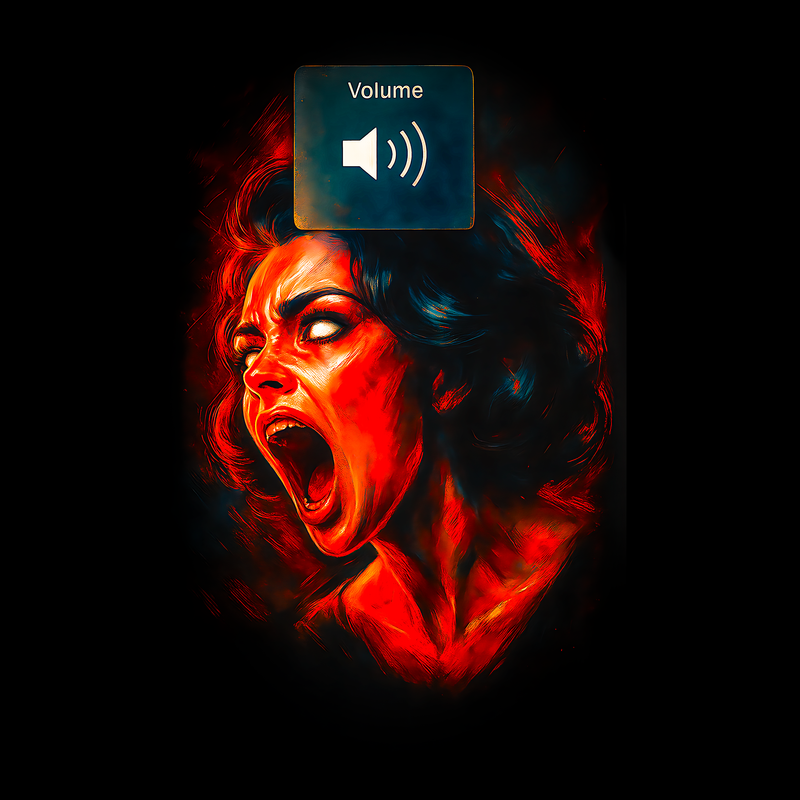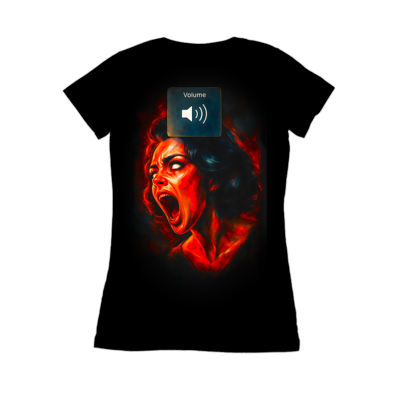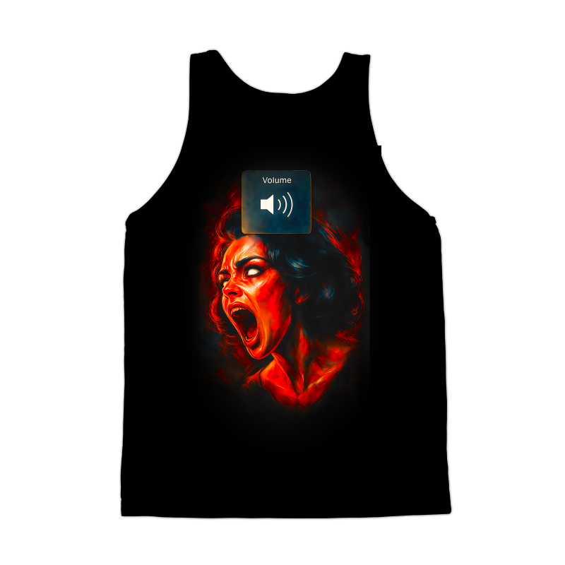 This striking design features a woman screaming, bathed in intense red hues, against a stark black background. The artwork evokes a sense of raw emotion and primal energy. The woman's face is contorted in a scream, her eyes wide and intense, creating a visually arresting image. Overlaying the portrait is a stylized 'Volume' icon, reminiscent of a smartphone interface, adding a modern, ironic twist to the classical art style. The color palette is dominated by shades of red, enhancing the feeling of anger and intensity. The brushwork is expressive, with visible strokes adding texture and depth to the overall composition. This design merges the intensity of human emotion with contemporary digital culture. Designers could use this image for album covers, posters, or even edgy clothing designs. The combination of intense emotion and modern technology makes it suitable for projects targeting a younger, digitally-savvy audience. It could also be used in advertising campaigns that aim to make a bold statement, or as a striking visual for horror or thriller media.