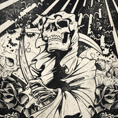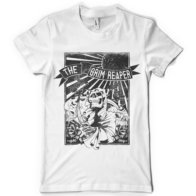 Scythe of death graphic design template in vector format, featuring detailed grim reaper coming after people now available for Adobe Illustrator, Adobe Photoshop and Corel Draw and can be used for digital printing and screenprinting .