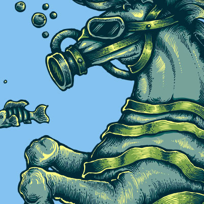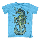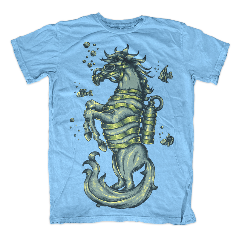 Illustration of fantasy creature called sea horse on blue aquatic marine water. Ready to print on t-shirt.