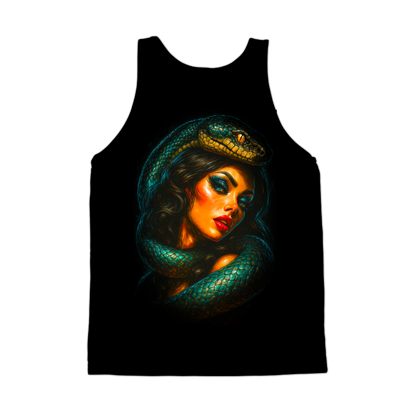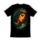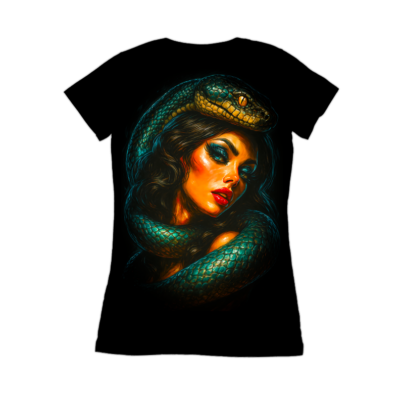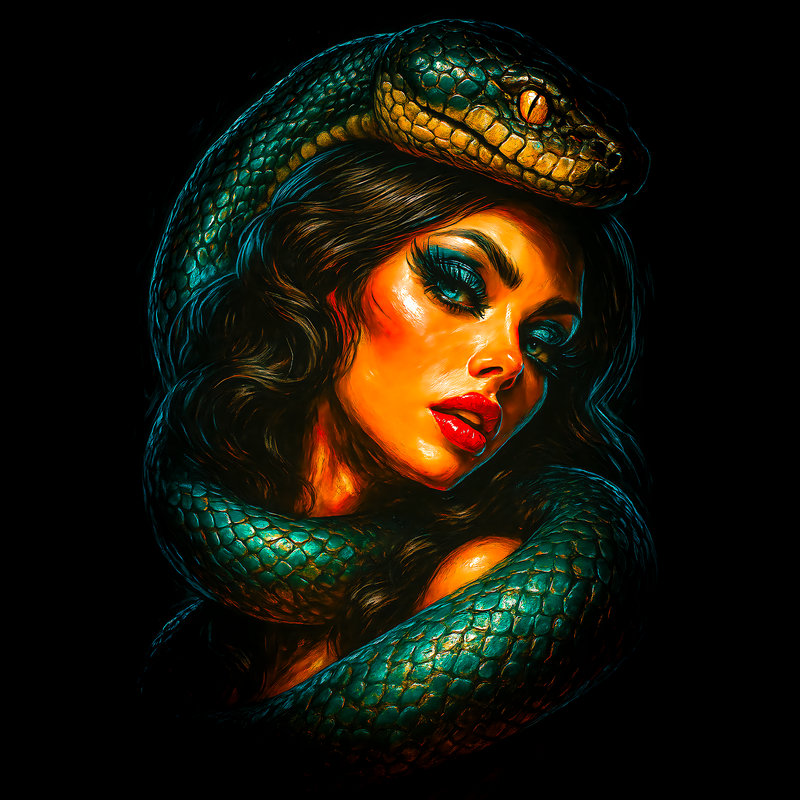 This design features a striking portrait of a woman entwined with a vibrant green snake. The woman's features are rendered with bold, contrasting colors, emphasizing her dramatic makeup and alluring expression. The snake, with its detailed scales and mesmerizing eyes, coils around her, creating a sense of both danger and allure. The artwork employs a blend of realism and stylized rendering, reminiscent of classic pin-up art with a modern, edgy twist. The overall composition is designed to capture attention, evoking a sense of mystery and power. The use of deep blacks in the background intensifies the vivid colors of the subjects, making them pop. This piece could be used in a variety of contexts, from fashion and beauty-related designs to more daring and unconventional projects. Designers could leverage this image for edgy apparel designs, striking posters, or even as unique branding for beauty products. Its bold colors and captivating composition make it suitable for promotional materials and digital art projects. The blend of classic and modern styles allows for broad appeal, from fashion enthusiasts to art collectors.