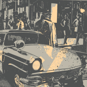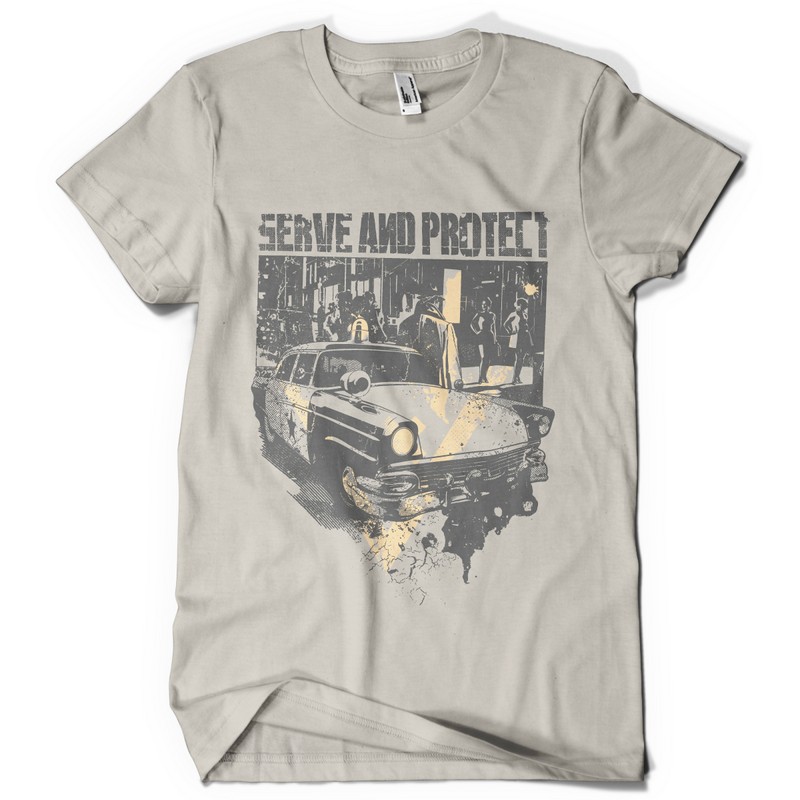 Serve and protect graphic design template in vector format, featuring detailed retro car now available for Adobe Illustrator, Adobe Photoshop and Corel Draw and can be used for digital printing and screenprinting .