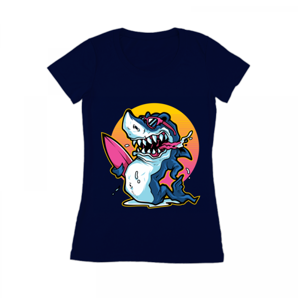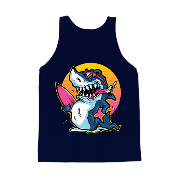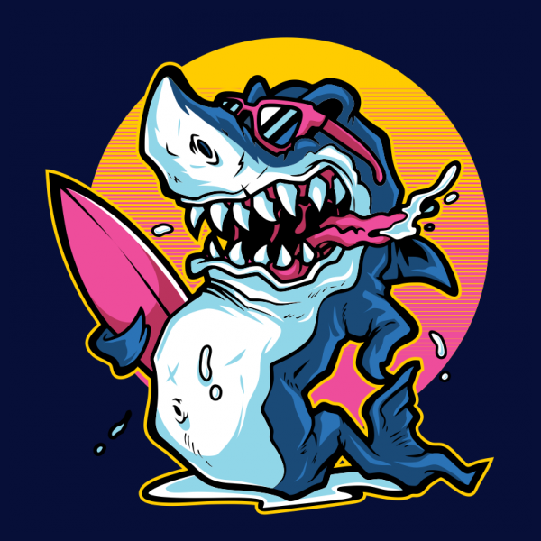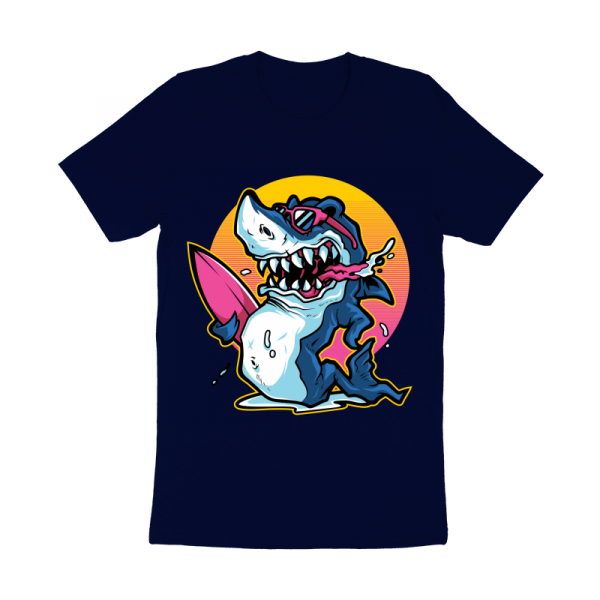 “Shark Surfing” Cartoon style. such as Ai,EPS,CDR, PDF and PNG Transparent. the design has 7 colors on black T-shirt. print it can be used for digital printing and screen printing