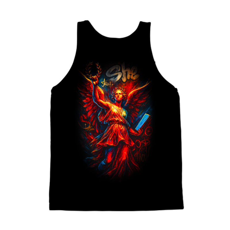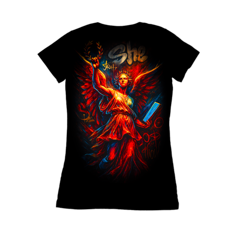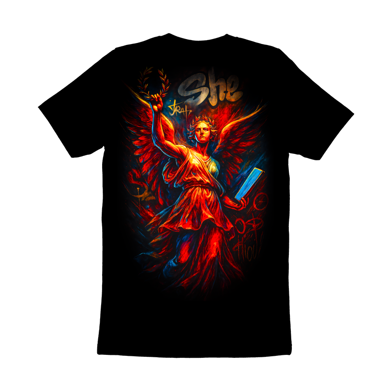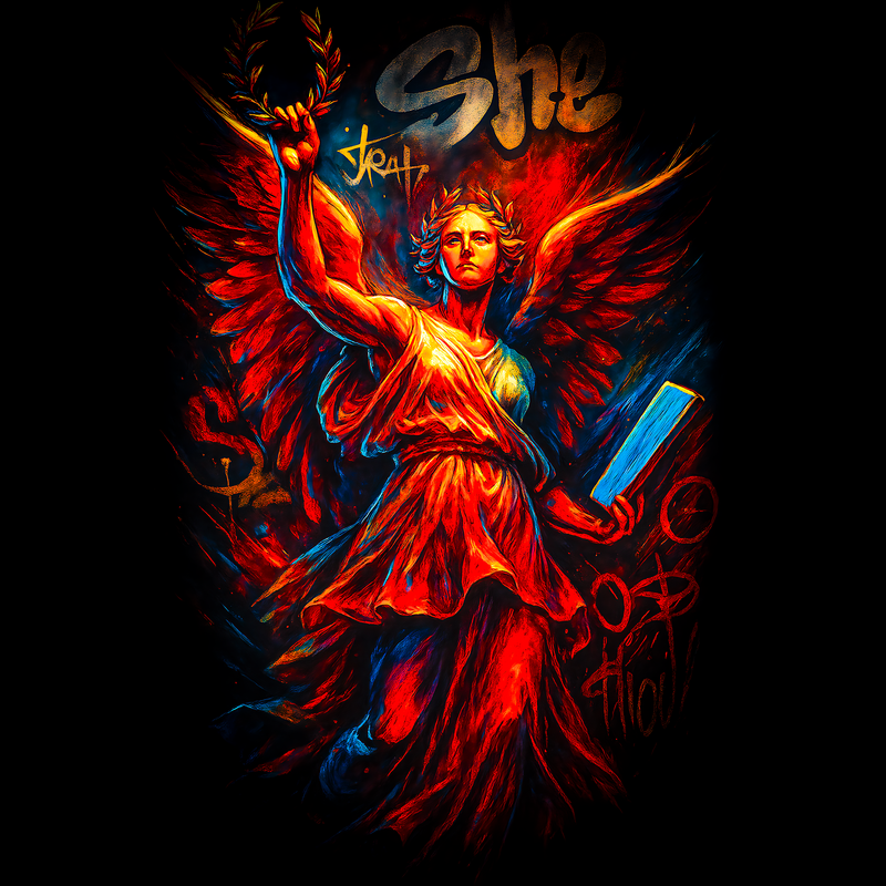 This striking design features a modern interpretation of a classical figure, rendered in a dynamic graffiti style. The central figure, a winged woman adorned with a laurel wreath, evokes a sense of victory and wisdom. Her flowing dress and powerful stance are reminiscent of ancient Greek or Roman sculptures, yet the vibrant color palette and bold outlines bring a contemporary edge. Splashes of red, orange, and blue create a sense of energy and movement, contrasting with the dark background. The word "She" is scrawled above, adding to the urban feel. The design blends classical art with street art aesthetics, creating a unique and eye-catching visual. Designers could use this image for apparel, posters, or album art. The blend of classical and urban styles makes it versatile for various projects. It would be particularly effective for brands targeting a young, artistic audience. The design could also be adapted for use in digital media, such as website backgrounds or social media graphics.