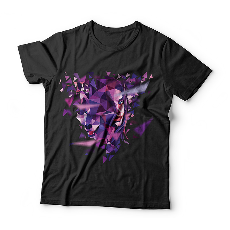 T-shirt design in polygon style. The file is available in PSD and PNG format and can be accessed with the Adobe Photoshop software. Can be used for digital printing.