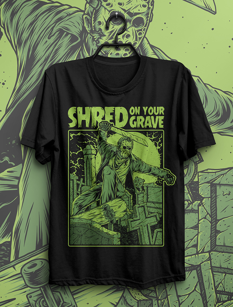 Shred on your grave design is a adobe photoshop with separate layers, using four different colors. The files including PSD and PNG with transparent background. Perfect for both digital print and screen printing.
