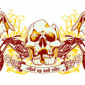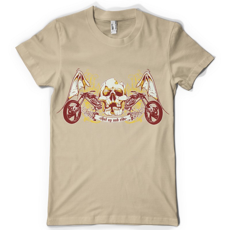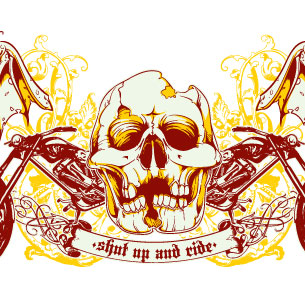 Shut up and ride design template in vector format, featuring detailed skull and bikes now available for Adobe Illustrator, Adobe Photoshop and Corel Draw and can be used for digital printing and screenprinting .