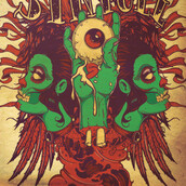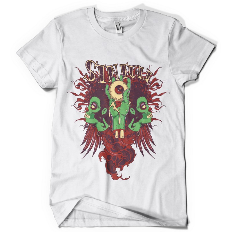 Sinful eye digital design template in vector format, featuring detailed hand holding eye and disco zombies now available for Adobe Illustrator, Adobe Photoshop and Corel Draw and can be used for digital printing and screenprinting .