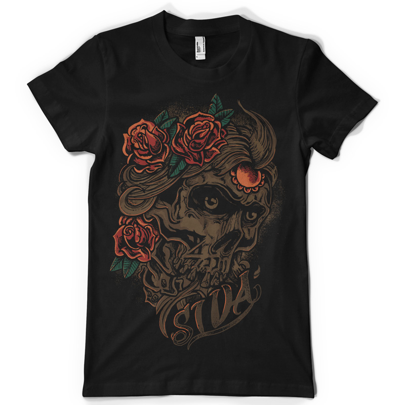 Siva printed t-shirt features a detailed screen print of skull with roses in her hair now available for Adobe Illustrator, Adobe Photoshop and Corel Draw and can be used for digital printing and screenprinting .